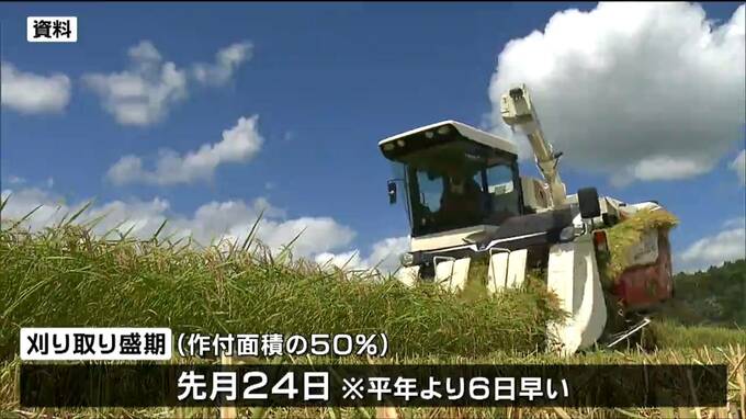 作付面積の50%で刈り取りが終わる「刈り取り盛期」は9月24日で、平年より6日早くなっています。これは、猛暑で、生育のスピードが平年より早くなったことなどによるものです。