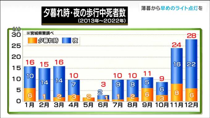 「オレンジ」は夕暮れ時「青」は夜に起きた事故の死者数です。日没が早まる秋以降に死者が多くなっています。