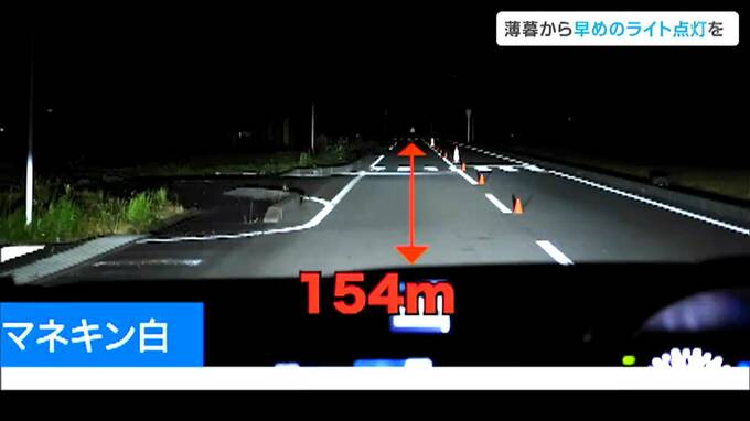 同じ白の服装で比較した場合、歩行者を認識できる距離が、ロービームで37.6メートルだったのが、ハイビームでは154メートルと4倍以上、長くなりました。