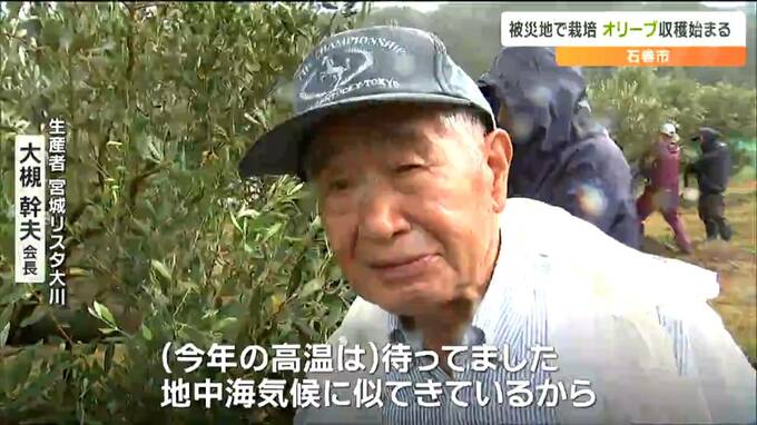 収穫が始まったのは、石巻市の震災遺構・大川小学校のそばにある農園です。地元の農業法人が、例年よりひと回りほど大きく育ったオリーブの実を手際よく摘み取りました。