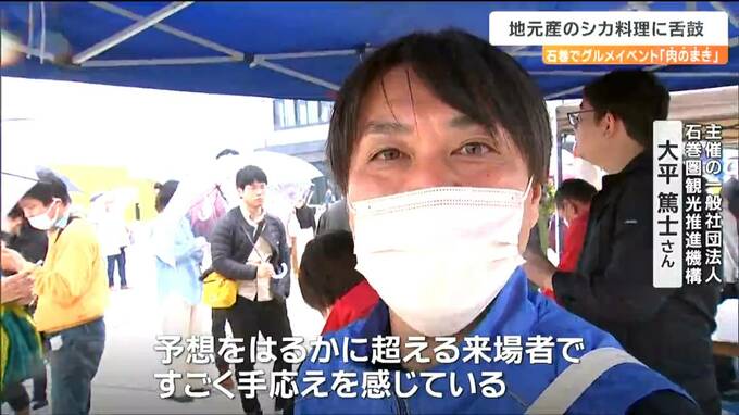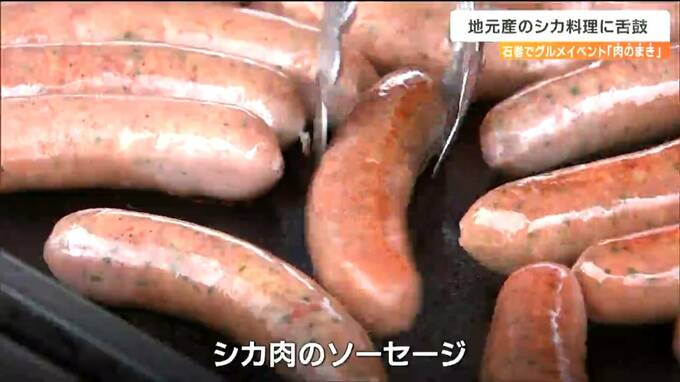 シカなどの肉料理を扱う店舗が一堂に会したグルメイベント、その名も「肉のまき」が、9日、宮城県石巻市で初めて開かれました。イベントは、大勢の市民でにぎわい地元産のジビエ料理が人気を集めていました。