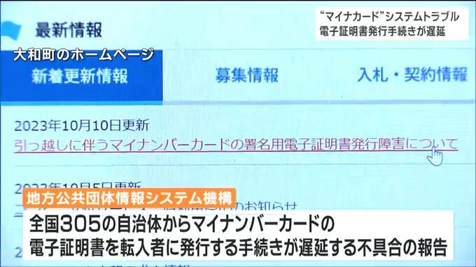 地方公共団体情報システム機構によりますと、10日午後3時時点で、全国305の自治体からマイナンバーカードの電子証明書を転入者に発行する手続きが遅延する不具合の報告があったということです。
