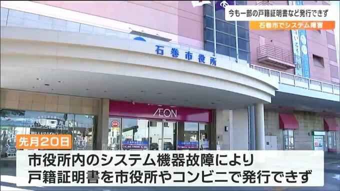 システム障害が発生しているのは石巻市の戸籍情報システムです。市によりますと、市役所内にあるシステムの機器が故障し、9月20日、戸籍証明書を市役所やコンビニエンスストアなどで発行できない状態になりました。