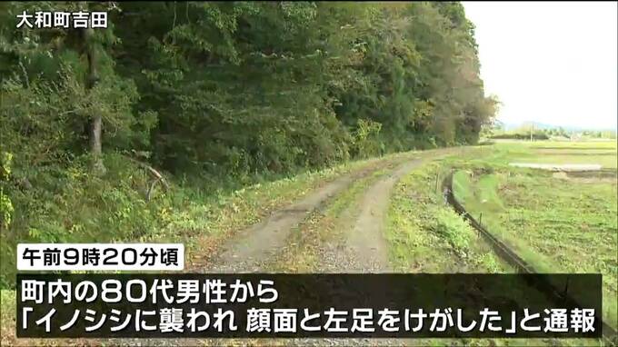 29日午前9時20分頃、大和町吉田の農道で町内に住む80代の男性から「イノシシに襲われて顔面と左足にけがをした」と消防に通報がありました。男性は、顔を引っかかれるなどして仙台市内の病院に運ばれましたが命に別状はないということです。