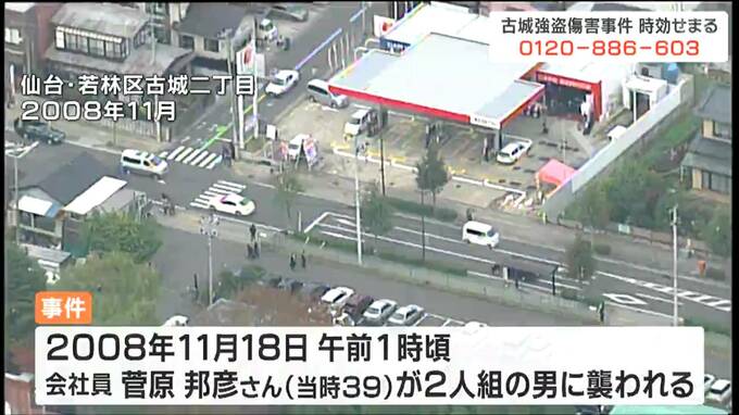 事件が起きたのは2008年11月18日午前1時ごろ。仙台市若林区古城二丁目の路上で当時39歳だった会社員の菅原邦彦さんが2人組の男に傘のようなもので左目を刺され、持っていたバッグを奪われました。警察は延べ2万3000人を動員し捜査してきましたが犯人逮捕には至っていません。