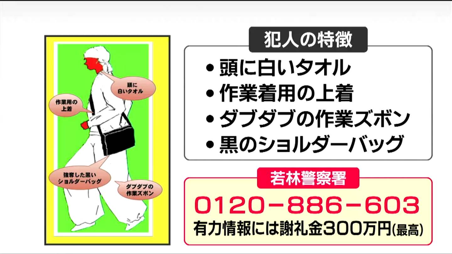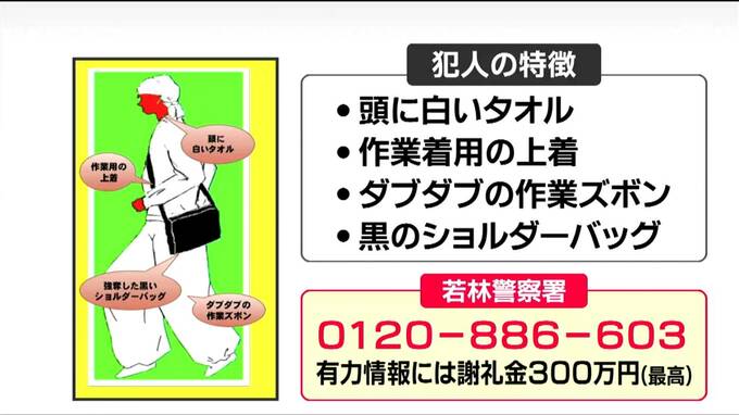 改めて、警察が発表している2人組の犯人の特徴です。事件当時、10代後半から20代で、現在は20代から30代とみられます。服装は、頭に白いタオル。作業用の上着、ダブダブの作業ズボン。菅原さんから奪った黒のショルダーバッグを持っていたということです。