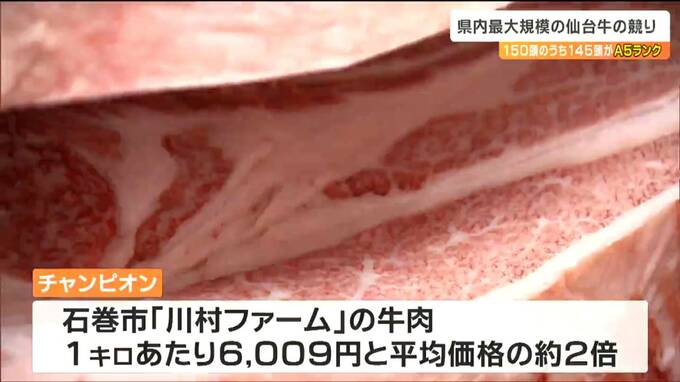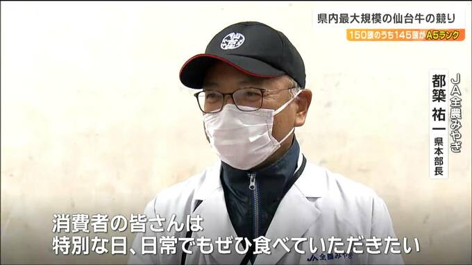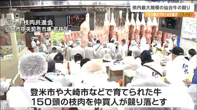 宮城県内で最大規模となる仙台牛の競りが7日、仙台市で行われました。競りにかけられた150頭のうち145頭がA5ランクで、県内のスーパーなどで販売されます。