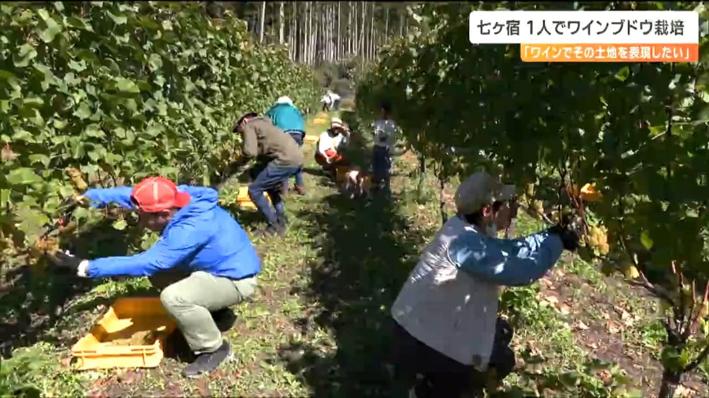 4年目となる収穫。この日は、県内外から手伝いに来たボランティアも加わって白ワイン用の品種「シャルドネ」740キロを摘み取りました。