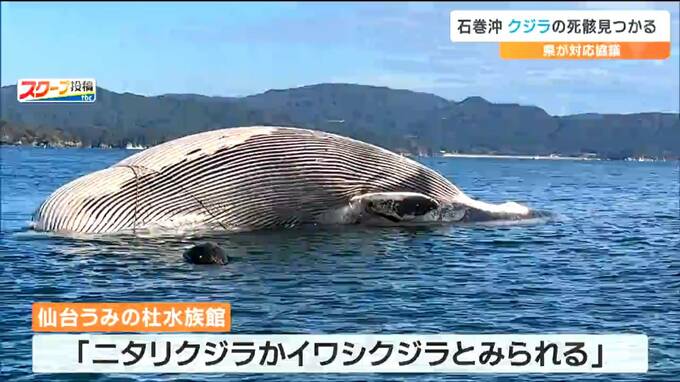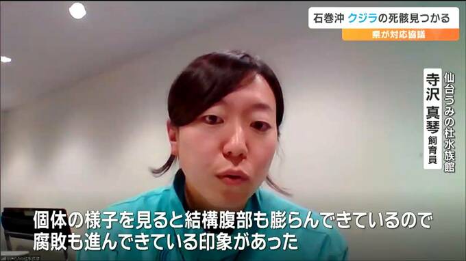 15日朝、宮城県石巻市の沖合で漁船の定置網に引っかかったクジラが見つかりました。クジラは死んでいて、体内にガスが溜まっているような状態だということで県が対応を協議しています。