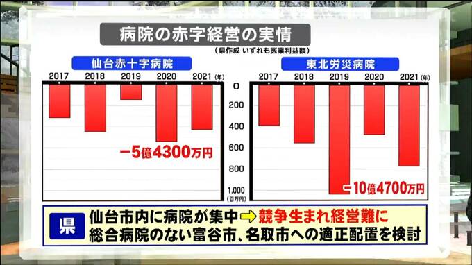 県は、仙台市内に病院が集中しているため競争が生まれ経営難に陥っている一方、同じ仙台医療圏の富谷市と名取市に総合病院がなく病院の適正配置が必要としています。