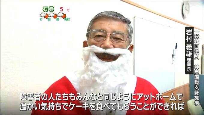 19日、石巻市門脇の障害者支援施設をサンタクロースに扮したボランティア団体「神戸国際支縁機構」のスタッフ5人が訪問しケーキを届けました。神戸国際支縁機構は毎月、車で片道15時間かけて石巻に通い、被災者の戸別訪問などを続けています。今回、プレゼントしたのは25個のホールケーキで、被災地に物資を送り続けている東京のせっけんメーカーの支援で実現しました。