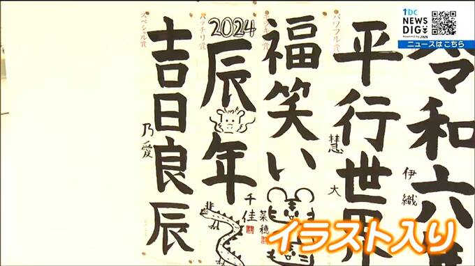 小中学生らの作品には今年の干支「辰」や鯛などのイラストを取り入れたものもあり、それぞれにキラキラ賞やスペシャル賞など書道会オリジナルの賞が与えられています。