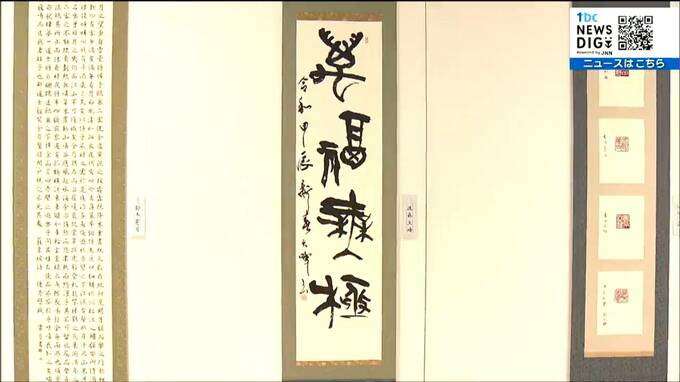 会場のせんだいメディアテークには東北書道会の会員らが手掛けた「漢字」や「かな」などの作品875点が展示されています。こちらは東北書道会会長、後藤大峰さんの作品です。「萬福無極(まんぷくむきょく)」という「限りない幸せ」を意味する言葉を篆書体で書き、文字の形の面白さが感じられる作品となっています。