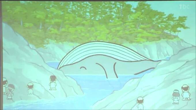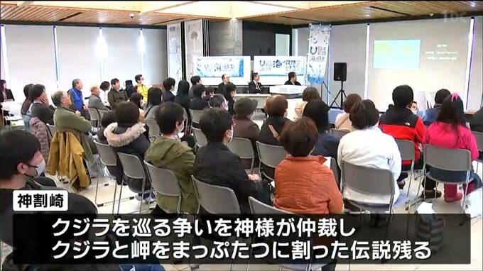 南三陸町と石巻市にまたがる神割崎には、現在の石巻市との境界があいまいだった時代、浜に打ち上げられたクジラを巡る争いを神様が仲裁し、クジラと岬をまっぷたつに割ったという伝説が残っています。5分ほどのアニメは会場を和ませていました。