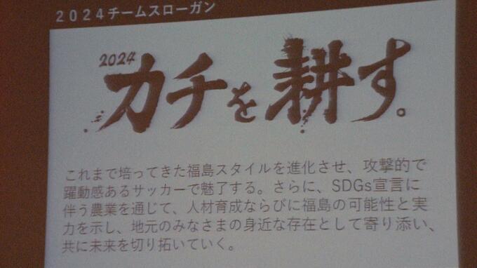 14日の結団式で発表された、福島ユナイテッドの今シーズンのスローガン。チームの「勝ち」や福島の「価値」を作り上げ、躍動感のあるサッカーを目指します。