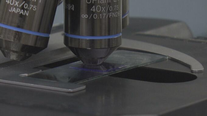 臨床検査技師・大沼正志さん「スライドガラスに薄くワセリンを塗ってあり、これに花粉を吸着させて染色液で染めて顕微鏡で見て、数を数えて報告しています」