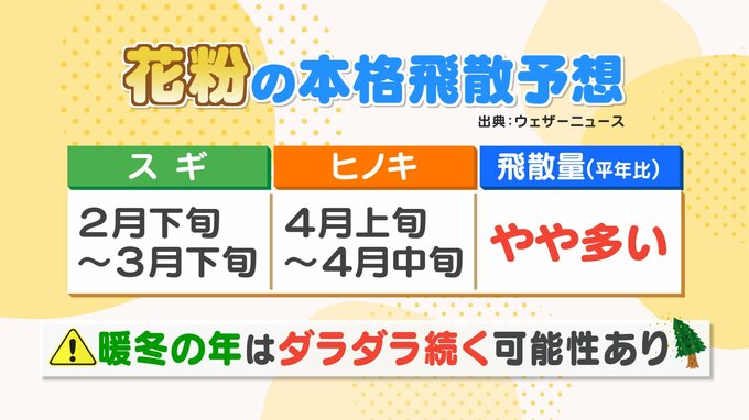 また、暖冬の年は、晴れて穏やかな日が続くため、花粉が一気に飛散せず、ダラダラ続く傾向があります。
