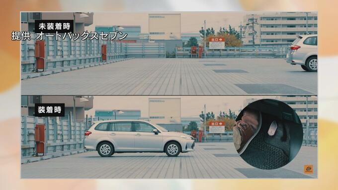 通常の車と装置を取り付けた車の映像を比較すると、誤ってアクセルを強く踏み込んでも急発進せず、その後ブレーキを踏んで止まるまでの違いが見て取れます。