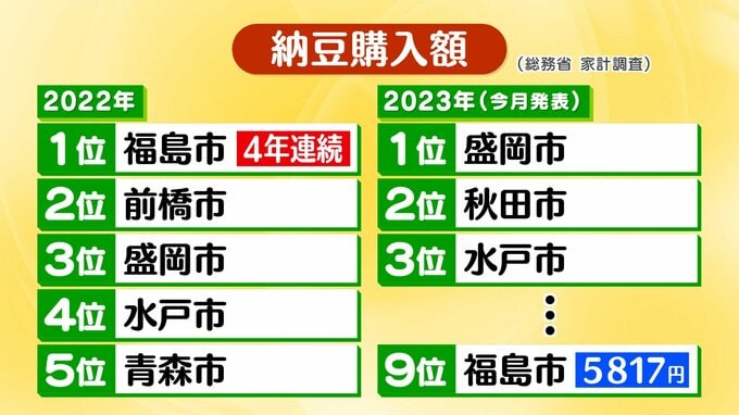 福島市の納豆購入額は、全国でも有数の高さを誇ります。総務省がまとめた1年間の1世帯あたりの納豆の購入額で、福島市は全国の都道府県の県庁所在地と政令指定都市の中で、2022年まで4年連続で日本一でした。ところが、今月発表された去年の購入額は5817円で9位に陥落しました。