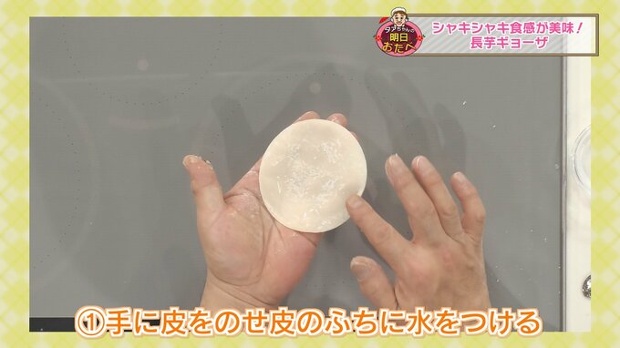 ①手に皮をのせふちに水をつける