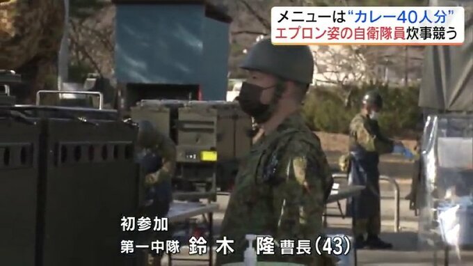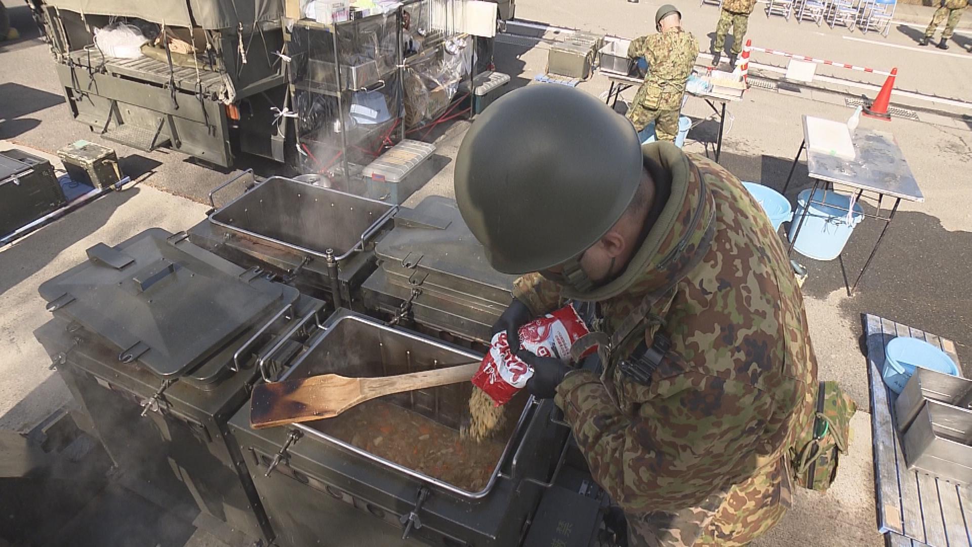 エプロン姿で料理をするのは、陸上自衛隊の隊員たち。災害時に必要となる炊事力の向上を目指した訓練が、福島市で行われました。作るのは、カレー40人分です。