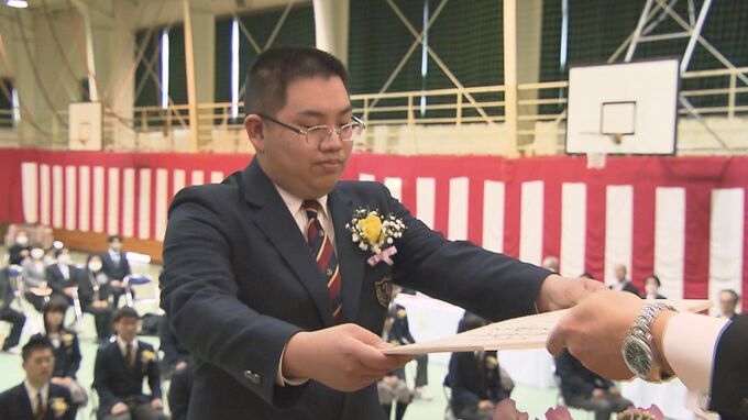 卒業生・大隅輝弥さん「寂しい気持ちもありますが、卒業できてとてもうれしく思う。自然あふれる学校で先生ひとりひとりが生徒に寄り添ってくれる、とてもいい校舎」