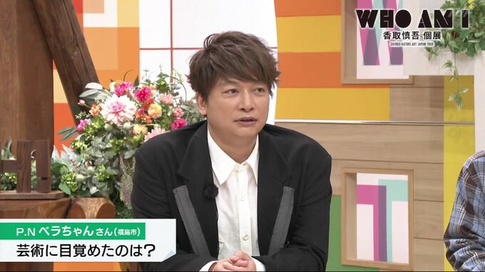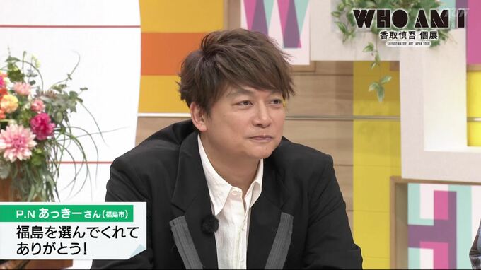 ---香取慎吾さん「まだ目覚めてない(笑)書きたいっていう思いだけで、書き続けてきていつか個展をしたいって。それこそ夢のように。だからちっちゃい頃から書いたものを全部保管してたから、いつかのために。今展示してあるもので十六、七の頃に書いたのとかも今回の福島で展示されてます。」