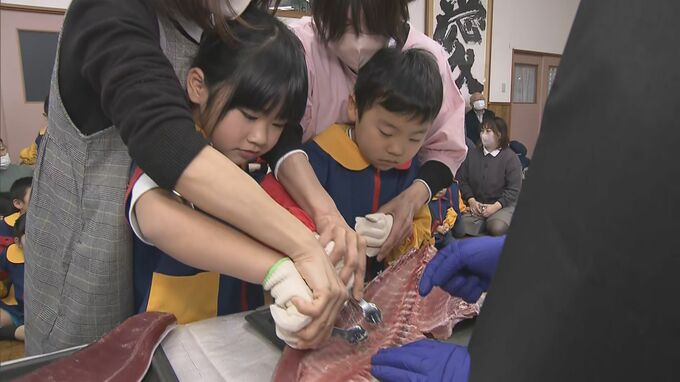こども園で「マグロ解体ショー」食材の命いただく感謝を学ぶ 福島・いわき市 2024年3月6日(水) 11:59 国内 食材の命をいただくことの「感謝の気持ち」を育んでもらおうと、福島県いわき市のこども園で、マグロの解体ショーが行われました。魚を解体する食育教育が行われたのは、いわき市の認定こども園「あざみ野こども園…