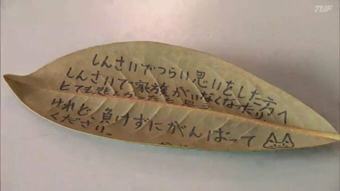 永野さんは、津波の被害にあった自宅から見つけた「じろはったん」という児童書にちなんで、毎年3月11日に県内外の子どもたちから復興へのメッセージなどを書いた木の葉を集め、海に流しています。