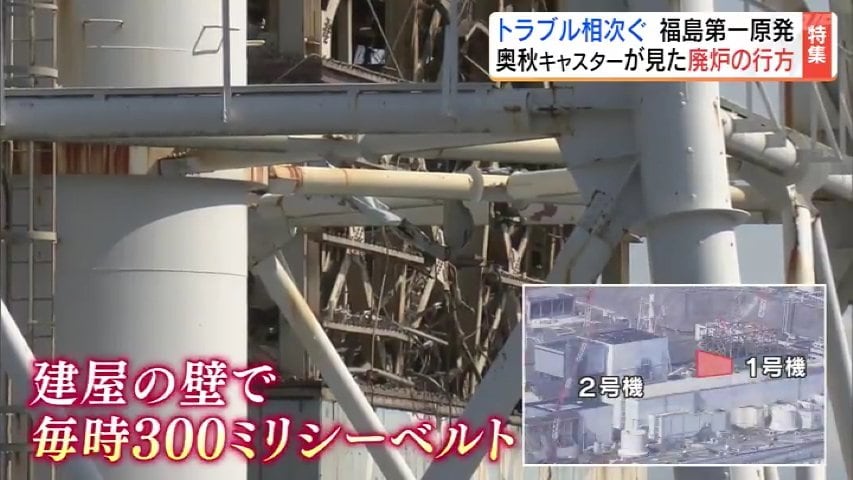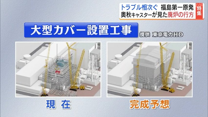 奥秋アナ「爆発で鉄骨がむき出しになった1号機ですが、現在大型カバーの設置工事が行われています」