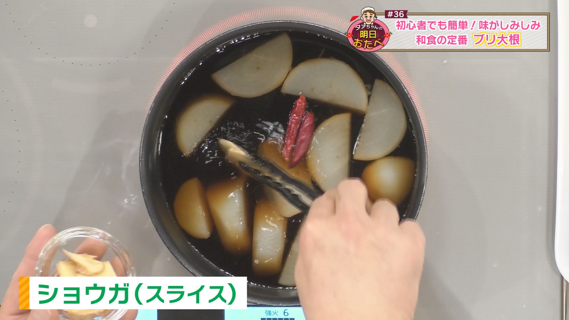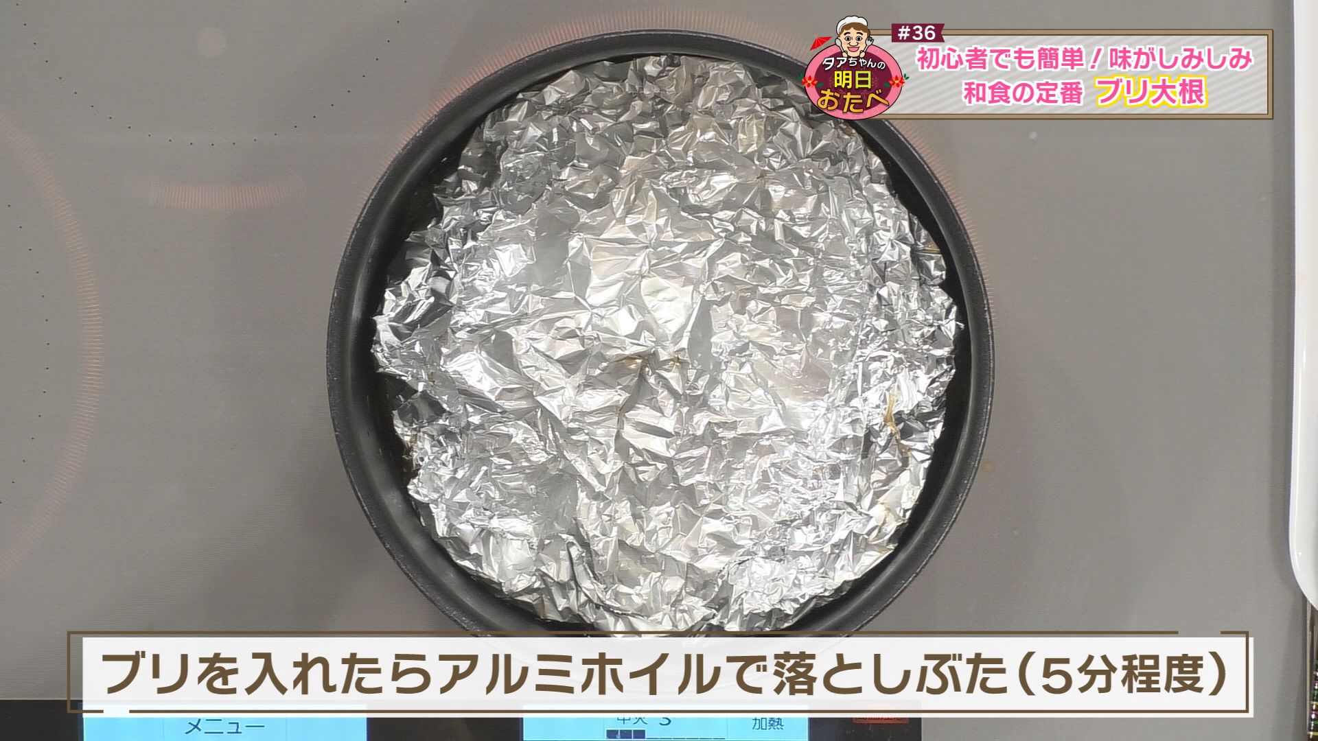 8.大根に味が染み込んだらブリを入れ、落しぶたをして5分程度加熱する