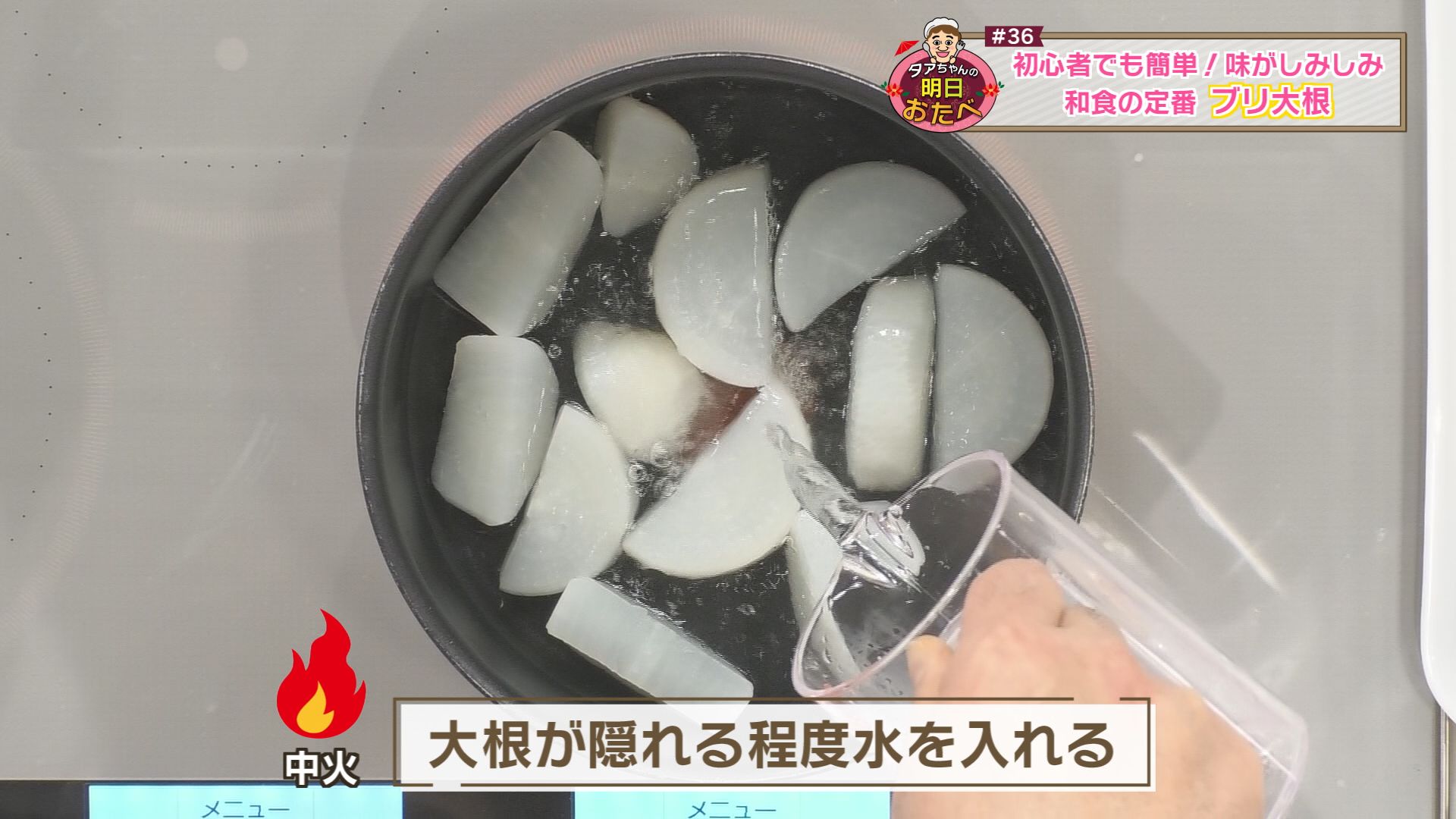6.鍋に大根を入れ、大根が隠れる程度の水を入れたら中火で加熱する