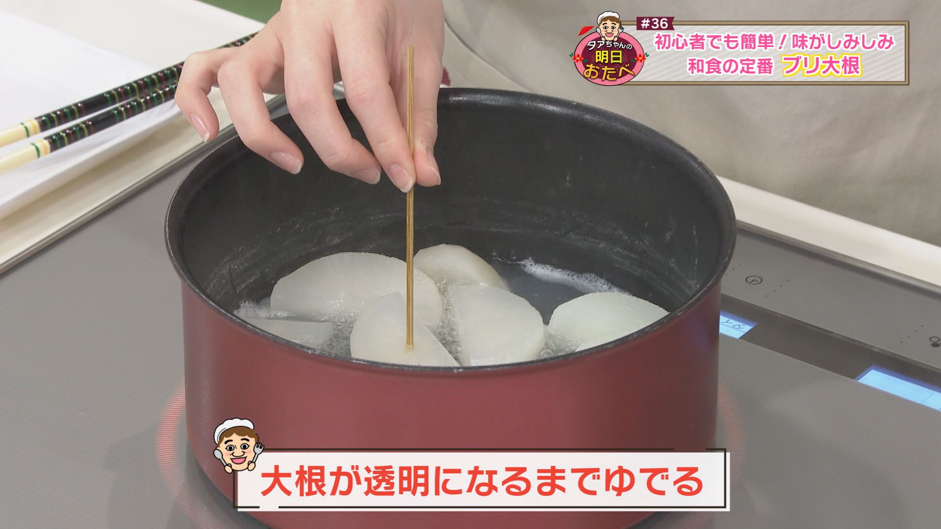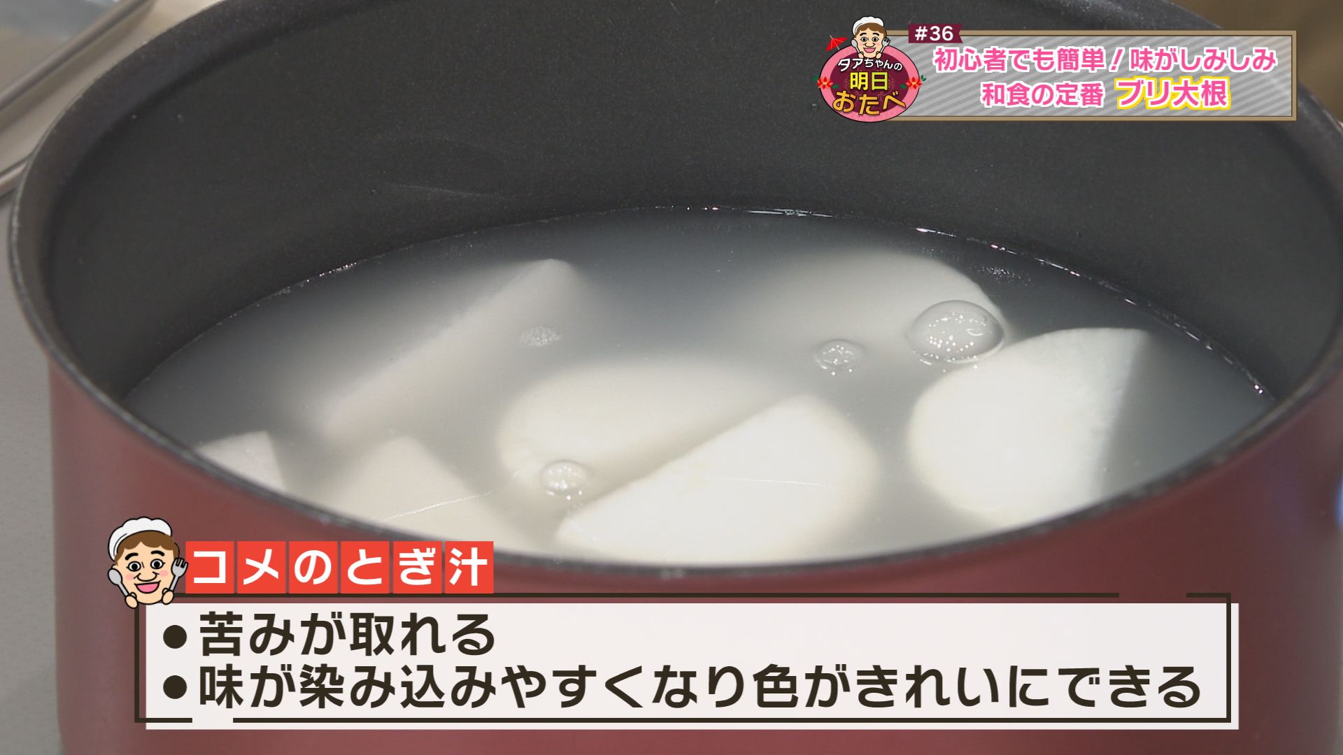 4.鍋に大根を入れ、大根が隠れる程度のコメのとぎ汁を入れて中火でゆでる。大根が透明になったらいったん取りだす