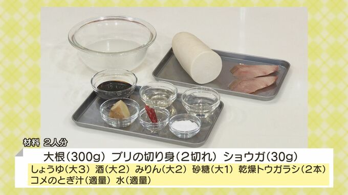 大根(300g)/ブリの切り身(2切れ)/ショウガ(30g)/しょうゆ(大3)/酒(大2)/みりん(大2)/砂糖(大1)/乾燥トウガラシ(2本)/コメのとぎ汁(適量)/水(適量)