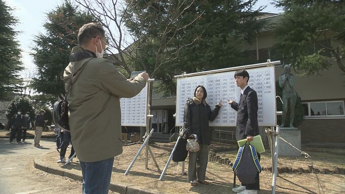 このうち、郡山市の安積黎明高校では、澄み渡る青空のもと、受験生と保護者がその時を待っていました。そして正午、合格番号が掲示板に貼り出されると、自分の番号を確認し、涙を流して喜ぶ受験生や、掲示板の前で記念撮影する姿が見られました。