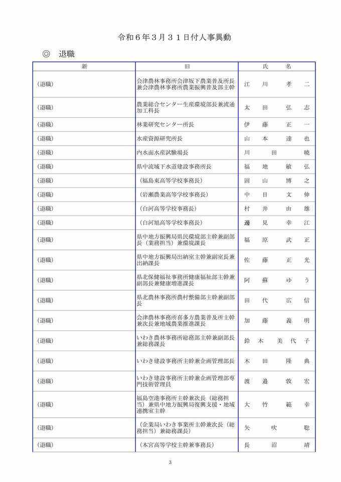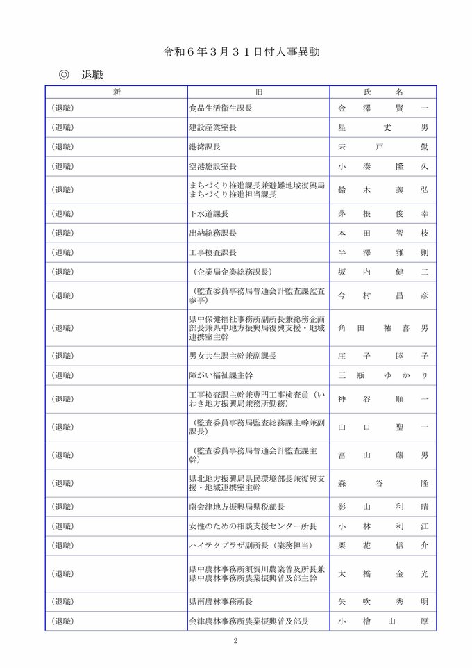 福島県職員人事異動2024年(令和6年春)課長相当職以上の職員の異動・退職者【名簿全掲載】
