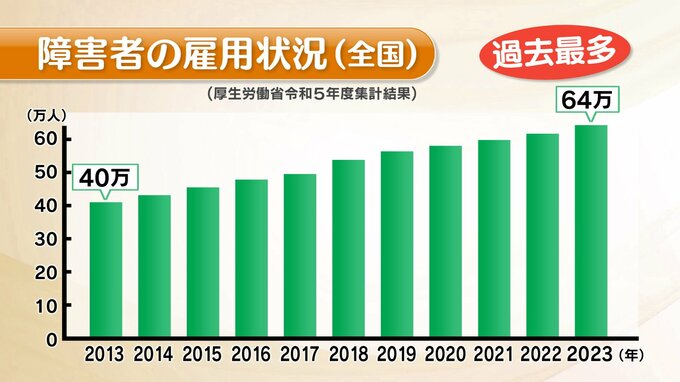 全国の障害者の雇用状況を見てみると、厚生労働省のまとめでは民間企業で働く障害者の数は年々増加していて、去年は64万人あまりと過去最多を更新しました。