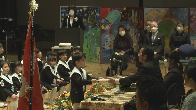 このうち、郡山市にある幼稚園の卒園式には、園児54人が出席しました。式では、一人ひとり子どもたちの名前が呼ばれたあと、園長先生から「元気で明るく天まで伸びよ!」というメッセージとともに、卒園証書を受け取りました。