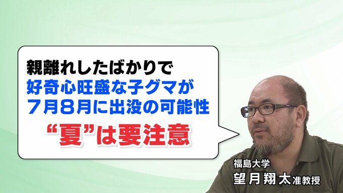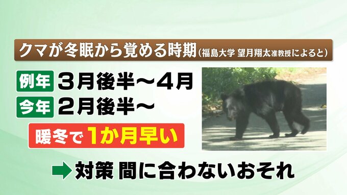 今年のクマは、いつもと傾向が違うと専門家は話します。野生動物の生態を研究を行う福島大学の望月翔太准教授によりますと、クマが冬眠から目覚めるのは、例年3月後半から4月ごろ、しかし今年は、暖冬の影響で1か月ほど早い2月末から確認されているそうです。そのため、いつもより早い出没にクマへの対策が間に合わないことが懸念されてます。