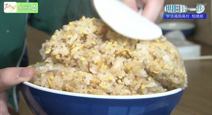 練習が終わるとみんなでテーブルを囲み、1人2合半分のご飯を平らげます。