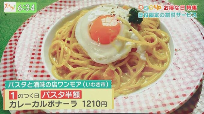 そんなワンモアではなんと、毎月1日、11日、21日、31日に12種類あるパスタが全て半額になるんです。一番人気の商品は『カレーカルボナーラ(通常1210円)』です。カレーのスパイシーさを味わいながら、卵をくずして味変できるパスタです。