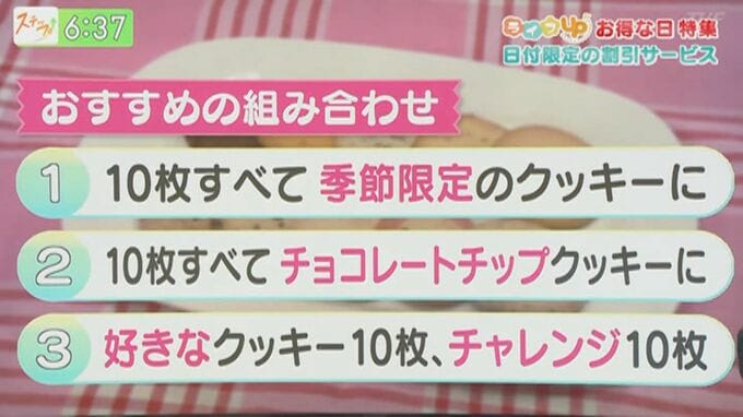 おすすめの組み合わせは、①10枚全て、季節限定のクッキーにする、②10枚全て、一番人気のチョコレートチップクッキーにする、③好きなクッキーを10枚、チャレンジしてみたい味を10枚組み合わせるなど、さまざま!そして今月はさらにお得になるんです!