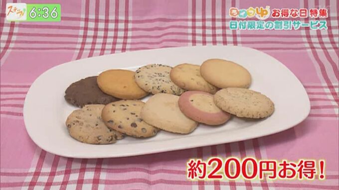 こちらでは毎月9日、19日、29日に量り売りクッキーが、通常10枚800円ほどのところ、10枚590円で購入できるお客様感謝デーを開催しています。この『チョコレートチップ』や『バタースカッチ』、桜の塩漬けが練りこまれた、季節限定の『さくら』といった味もありまして、15種類ほどのクッキーの中から好きなものを組み合わせて購入できます。通常よりも200円ほどお得とのこと。