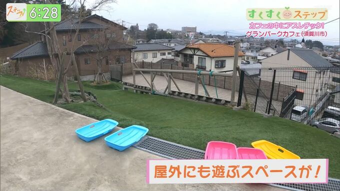 さらに、屋外にも遊べるスペースが。芝生の上をソリで滑ったり、丸太で作られたアスレチックも楽しめます。