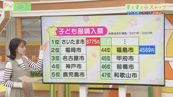 --平岡沙理(TUFアナウンサー)「子育て世代に注目していくコーナー、【すくすくステップ】。実はこんな気になるデータがあるんです。2021年から2023年までの1世帯当たりの子ども服の購入金額ランキング。1位はさいたま市、そして2位は福岡市と続いていますが・・・44位に福島市が入っています。1位のさいたま市は8775円に対して、およそ半額の4569円が福島市となっています。先ほどのカフェでこんな質問をしてみました。」