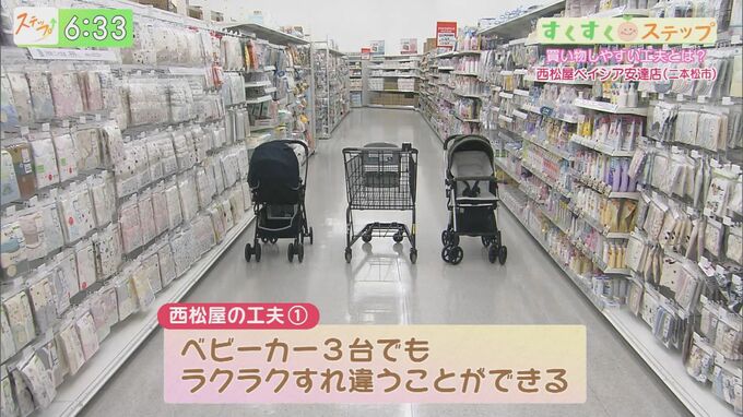 子ども用のパンツが599円!Tシャツが359円!激安価格の商品が並ぶこちらのお店。日本全国におよそ1110店舗以上展開する、子育て世代の強い味方『西松屋』です。広々とした店内にはたくさんの子ども服がところせましと並んでいます。先月オープンしたばかりの西松屋 ベイシア安達店。ところで、西松屋では子連れでも買い物がしやすい工夫がされているそう。