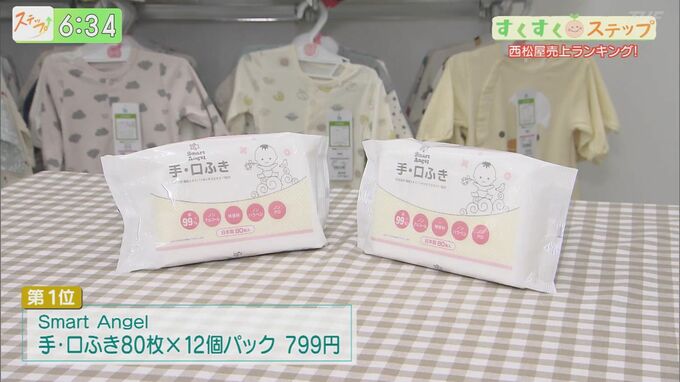 --山田健太 地区長(西松屋ベイシア安達店)「売り上げランキング第1位は、『手・口ふき80枚入り』です。外出先でも安心してお使いいただける80枚入り。1パック当たり約66円とお財布に優しい低価格で年間120万個売れている大ヒット商品です。」