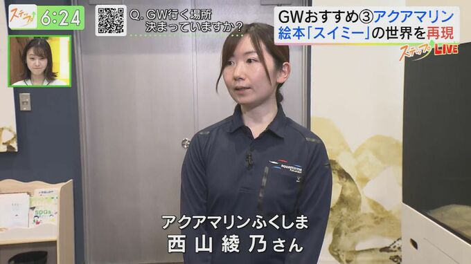 --西山綾乃(アクアマリンふくしま)「はい。スイミーの物語に出てくる様々な生き物を展示しています。スイミーのように群れになったり、岩場に隠れたりする生き物の生きる知恵や工夫を紹介しています。」