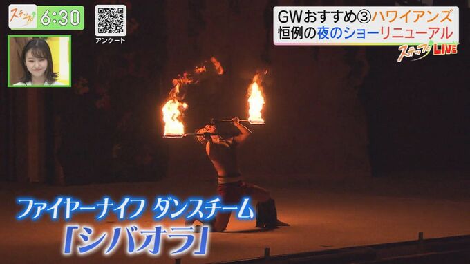 もう一つの目玉は、ファイヤーナイフ ダンスチーム『シバオラ』のパフォーマンスです。フラガールの華麗な踊りとシバオラの圧倒的なパフォーマンスで、気分はもう常夏のパラダイスです!