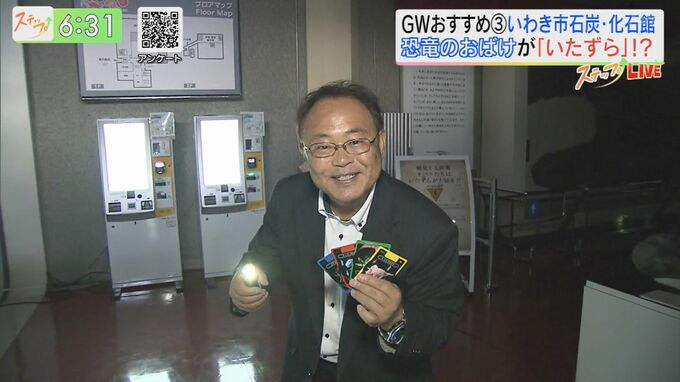 再オープンを記念して新たな企画『ほるるクエスト』が登場しました。〝ほるるクエスト″は恐竜のおばけがいたずらをして館内が停電したという想定で、懐中電灯を片手に、恐竜カードを4枚持ち(購入)、停電の「謎」を突き止めるというゲームです。